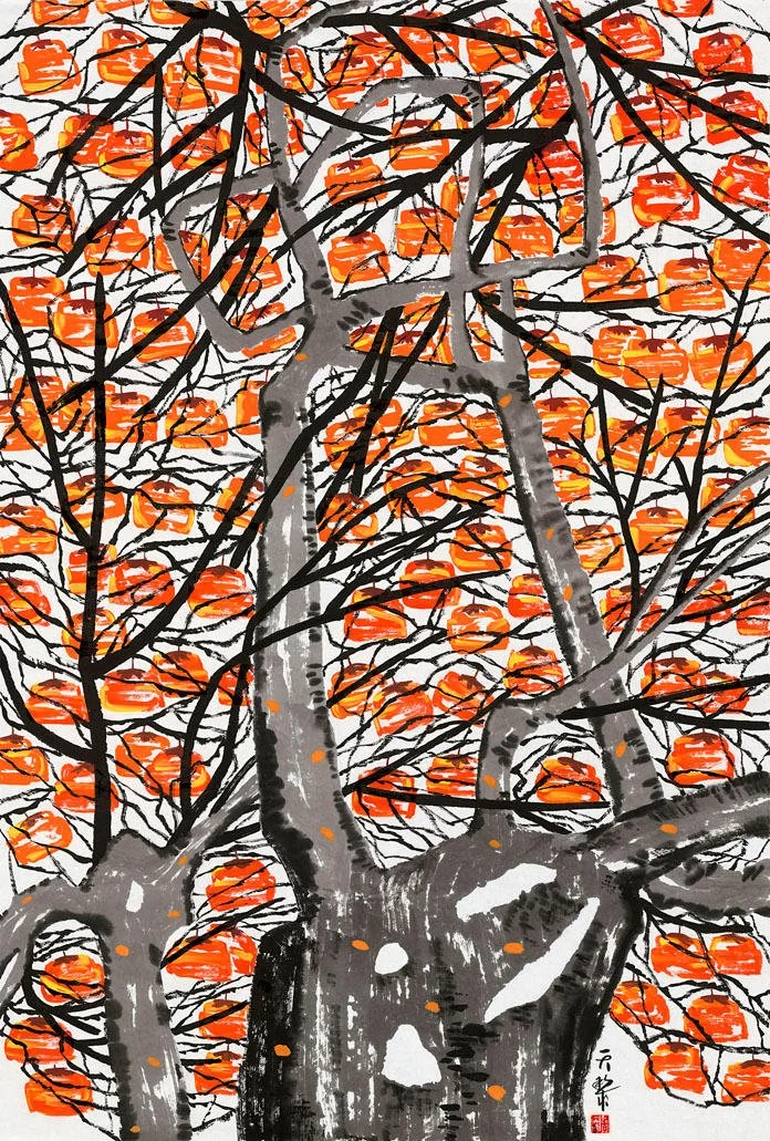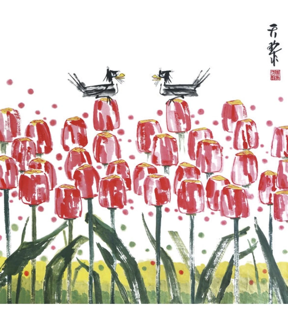 有形寫無形,意象化的花瓣似乎從紅色的海洋中升騰而出,上空則用剛勁線條勾勒出一隻與之對立的禿鷹,張開翅膀慌張地注視著沸騰轟烈的爛漫。